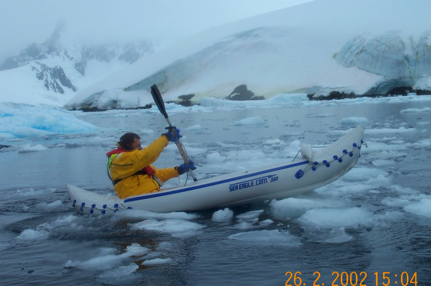 Captain Andy paddles in the snow in his rubber canoe